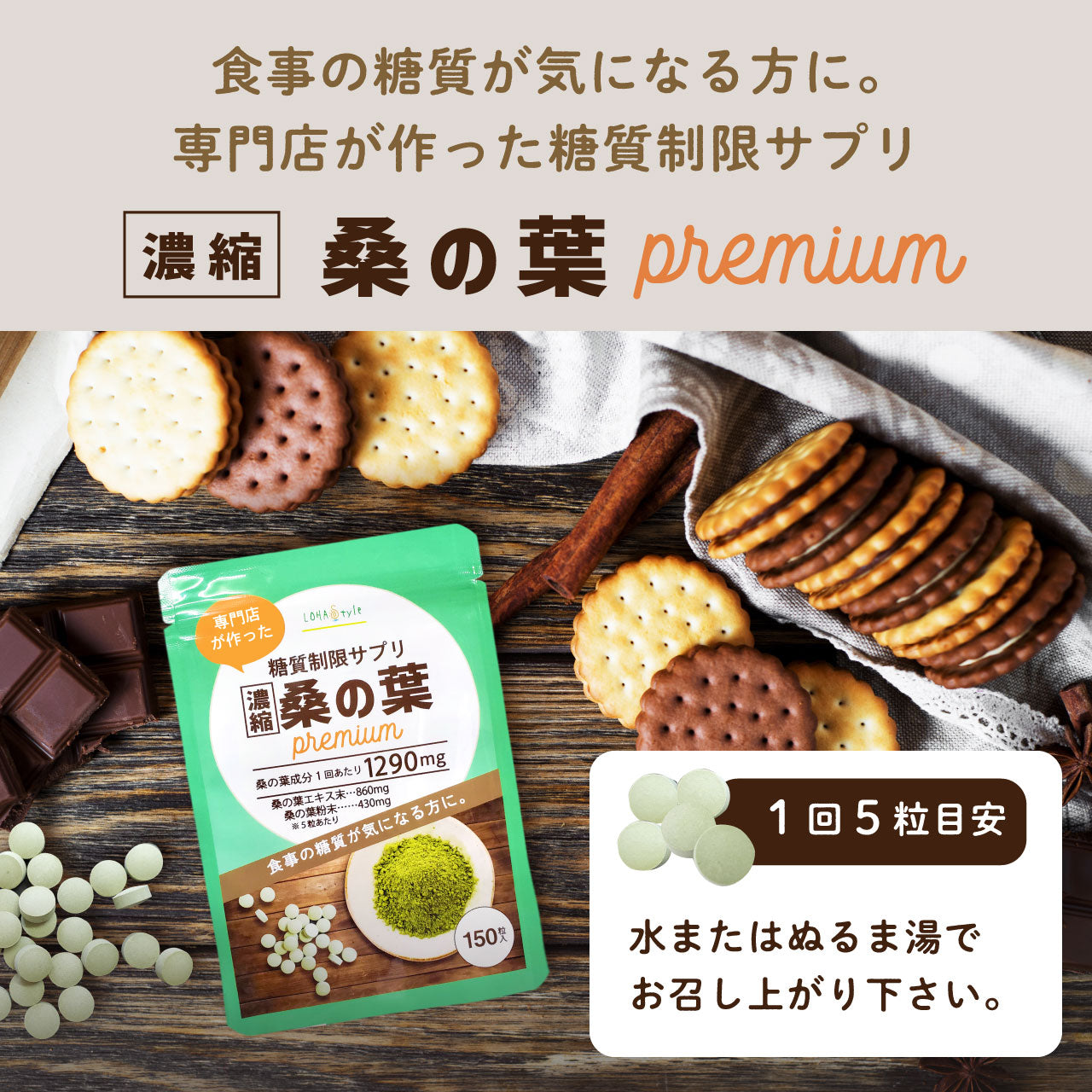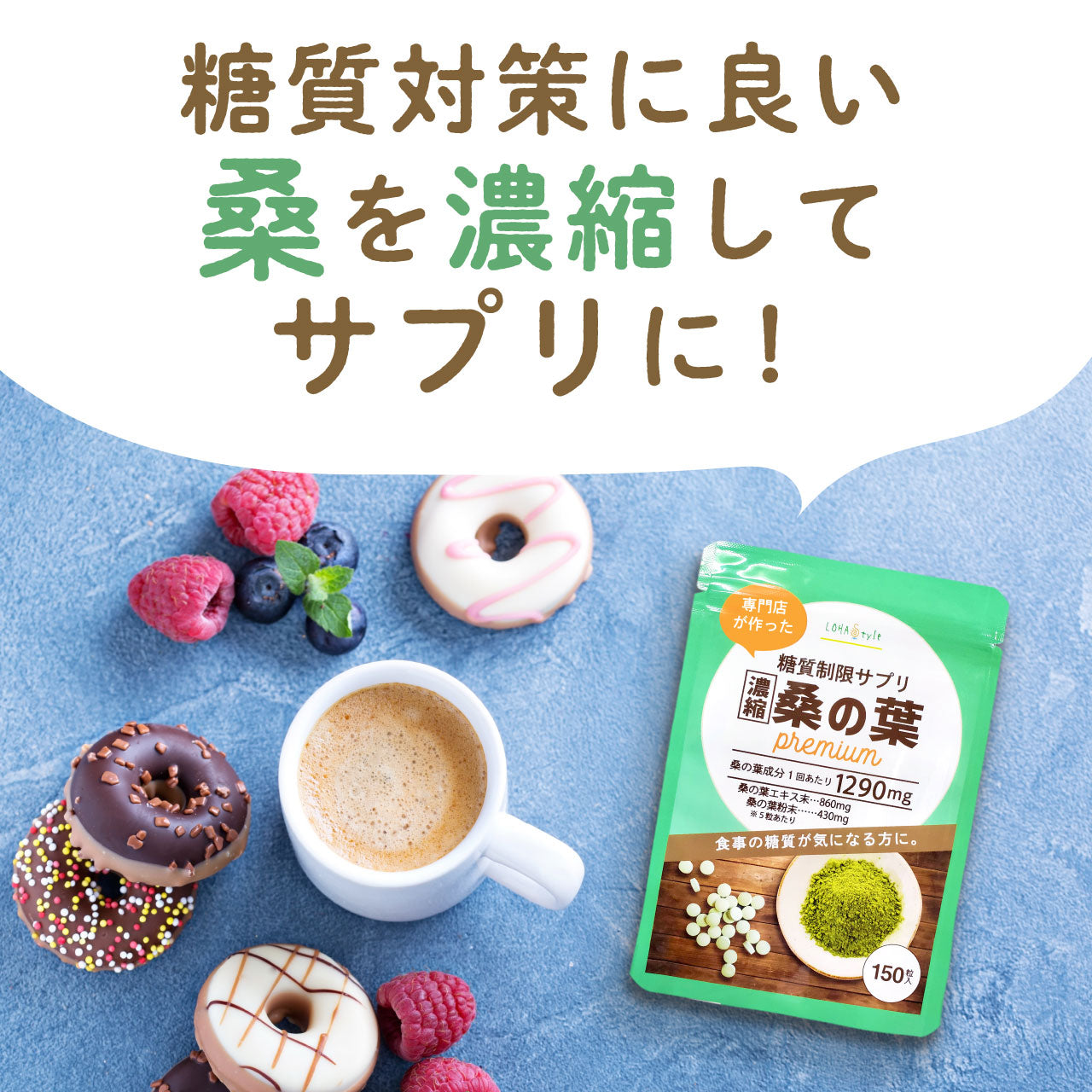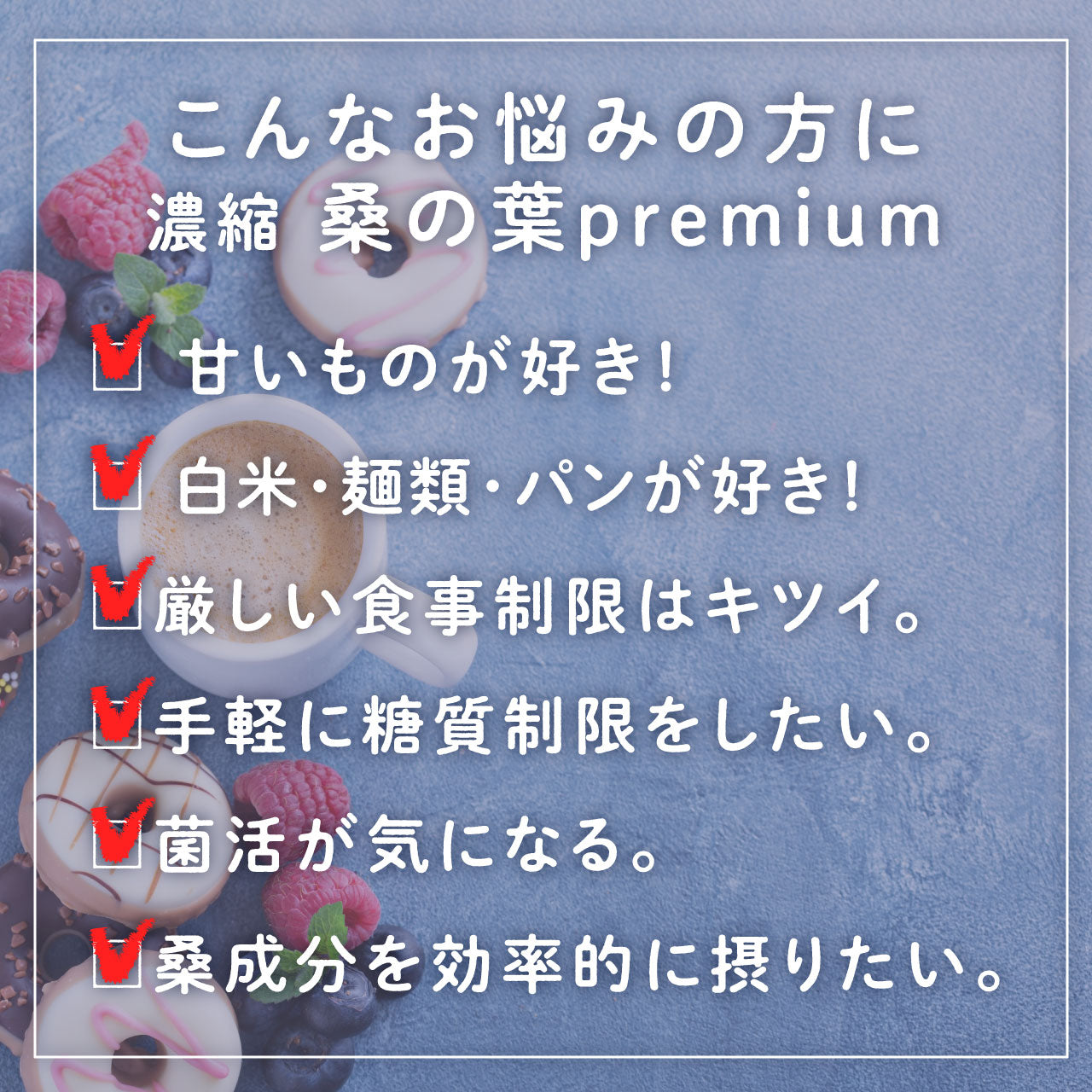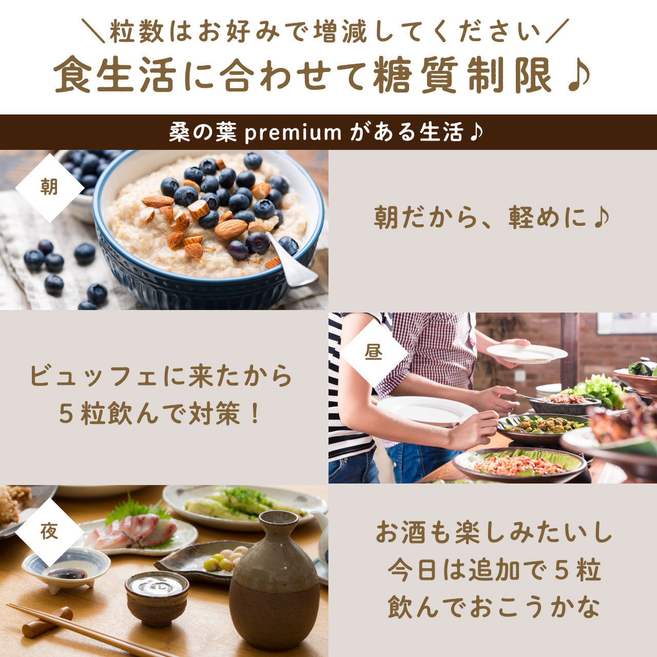 桑の葉成分を濃縮したエキスを使用したサプリなので桑成分が5粒で1290mgも配合!毎日の健康習慣に、お食事前の対策サプリ桑の葉premium!
