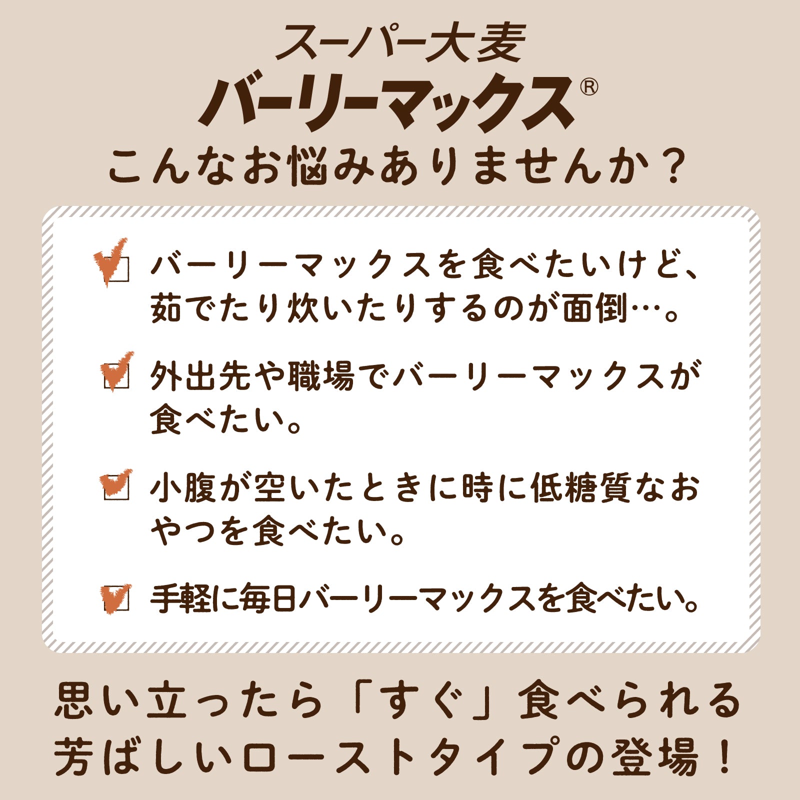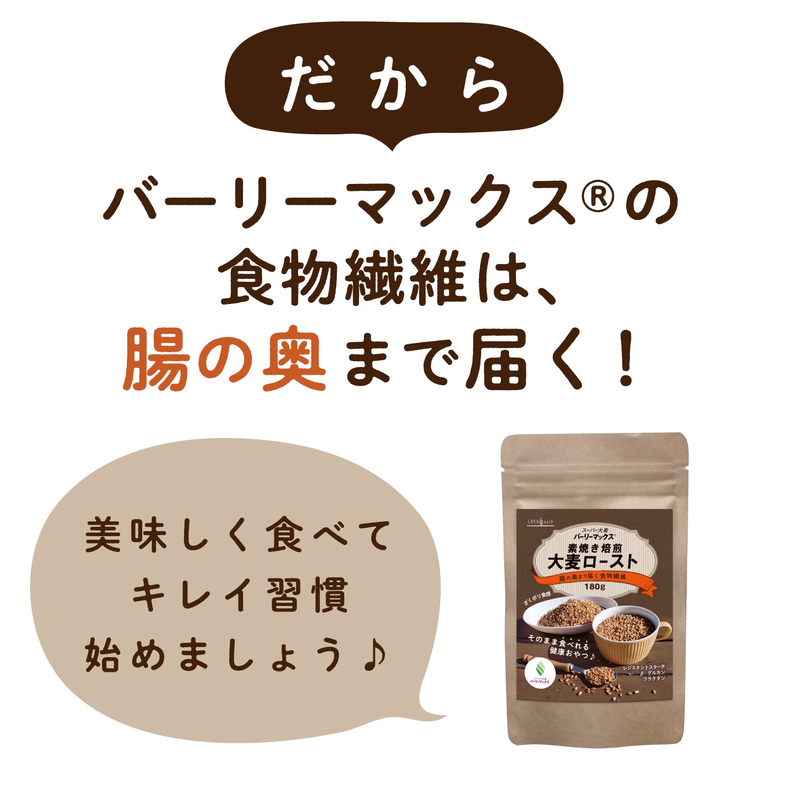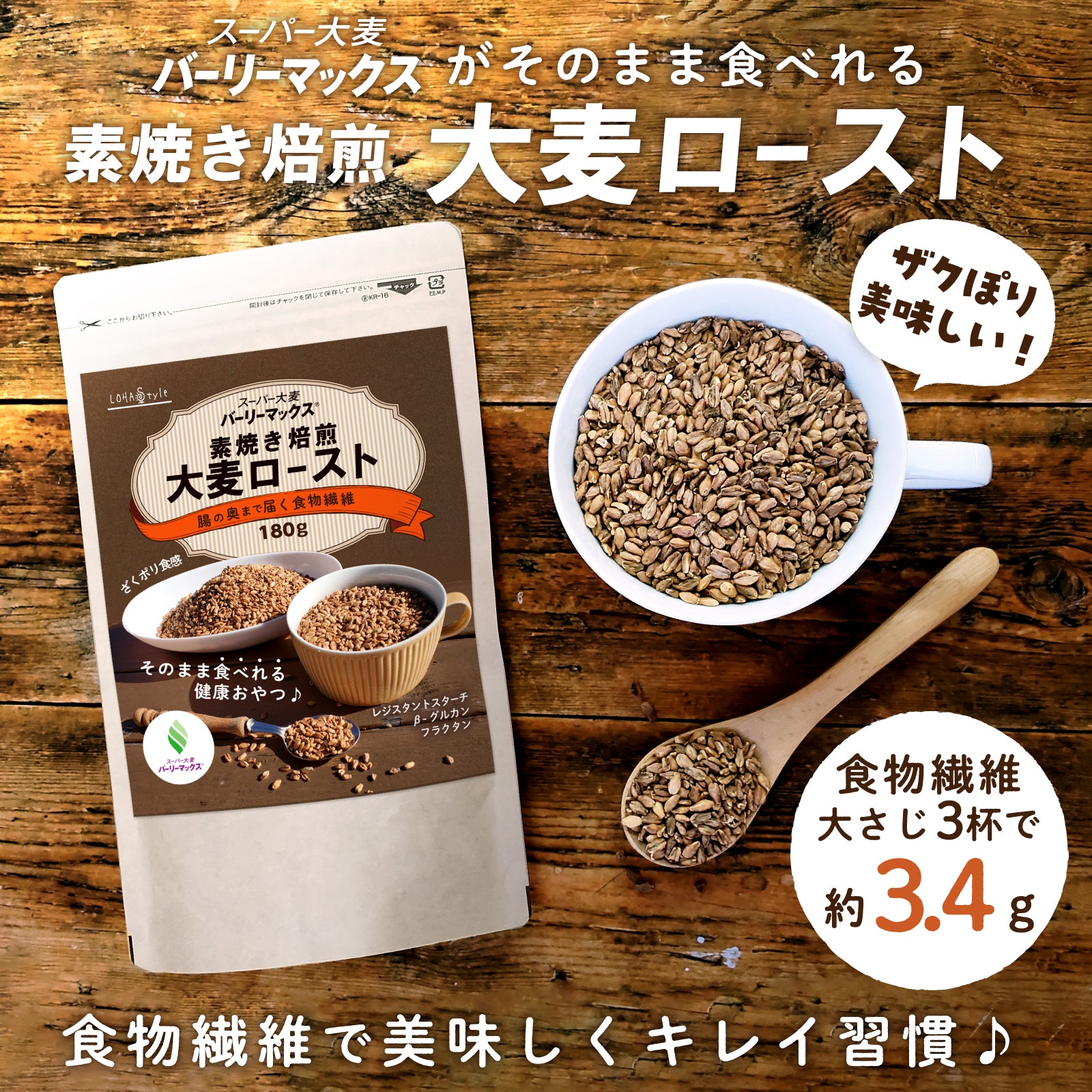 バーリーマックス玄麦を素焼き焙煎ローストに!ざくポリ食感がおいしい手軽に食べれる健康おやつです。